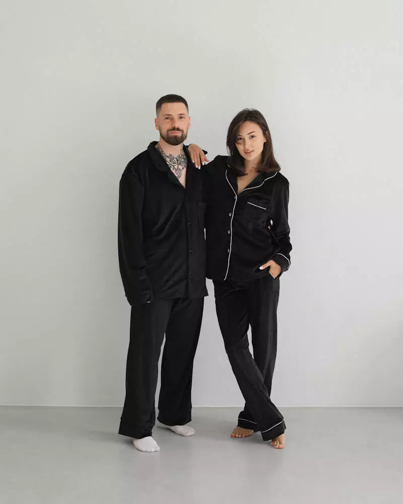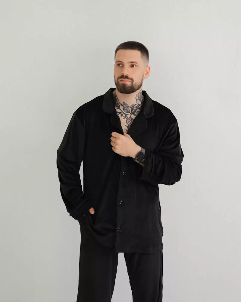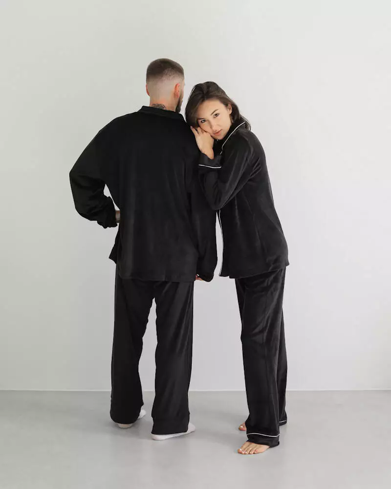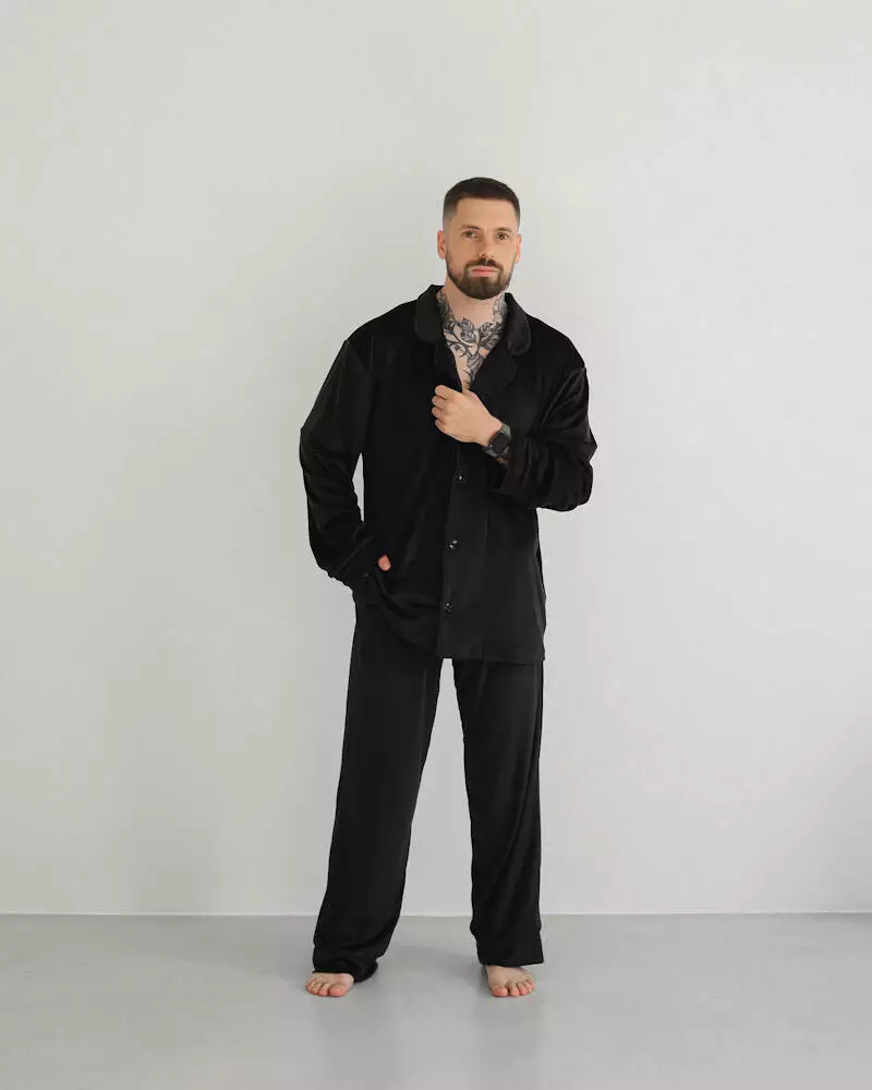 Чоловіча піжама з якісного турецького велюру на бавовняній основі. Комплект: сорочка на ґудзиках із кишенею на грудях та вільні штани з кишенями. Матеріал м'який, досить приємний, не линяє після прання, не сипеться, теплоємний, довго зберігає початковий вигляд.