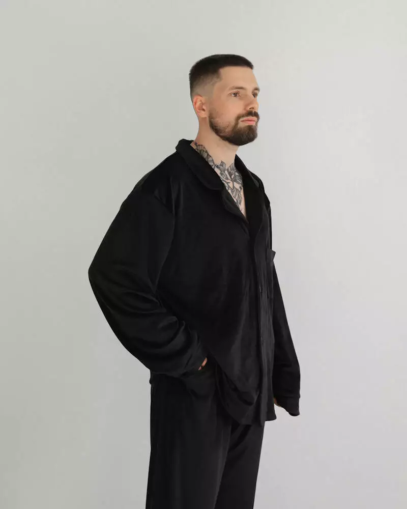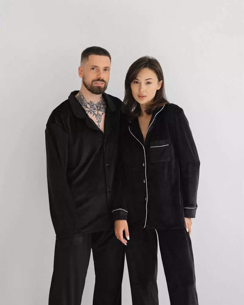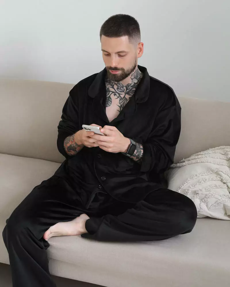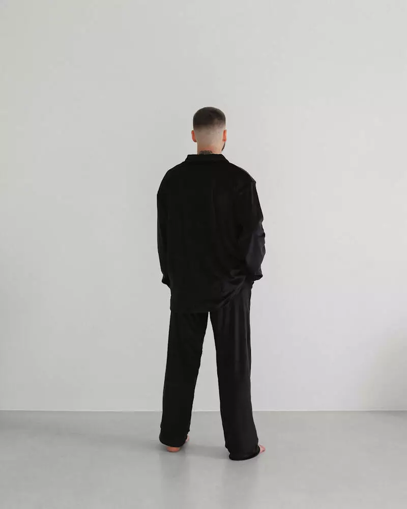 Чоловіча піжама з якісного турецького велюру на бавовняній основі. Комплект: сорочка на ґудзиках із кишенею на грудях та вільні штани з кишенями. Матеріал м'який, досить приємний, не линяє після прання, не сипеться, теплоємний, довго зберігає початковий вигляд.