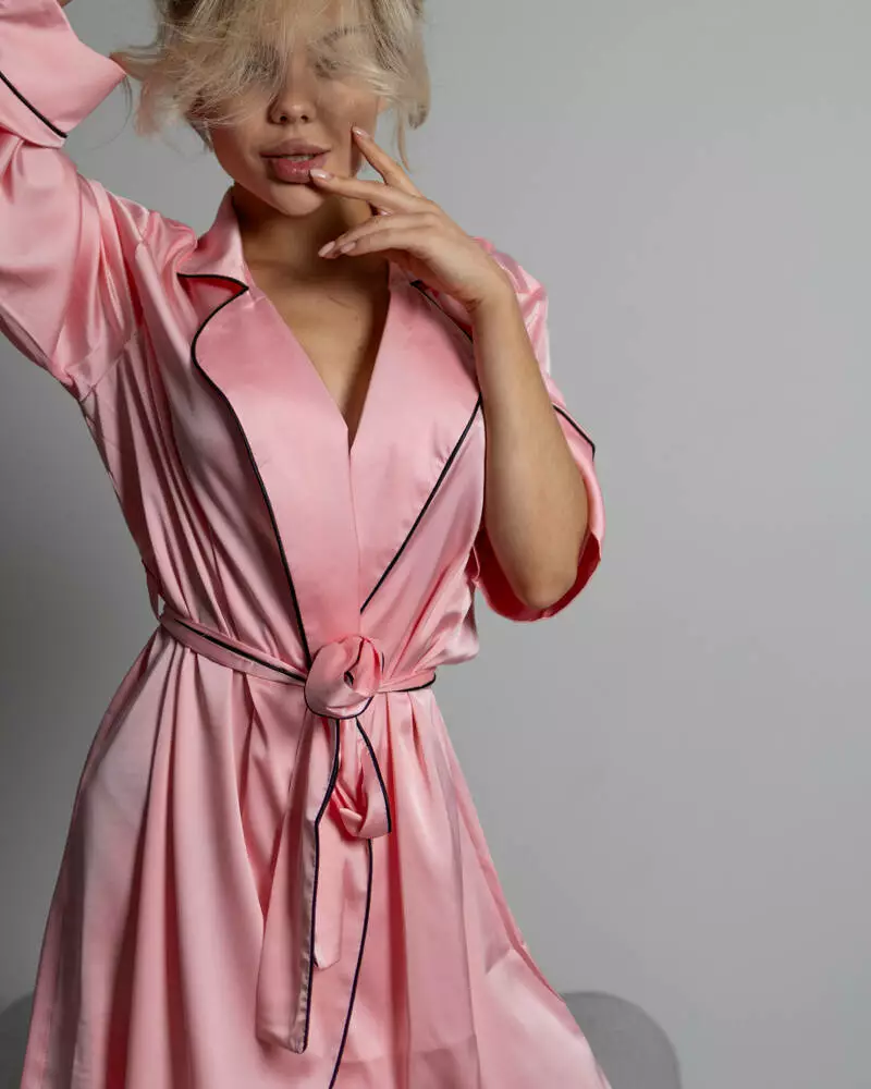Легкий халат з шовку Армані представлений у трьох кольорах. Модель стилізована коміром піджачного типу з кольоровим кантом та поясом. У такому халаті комфортно займатися домашніми справами, він чудово поєднується із нічною сорочкою.