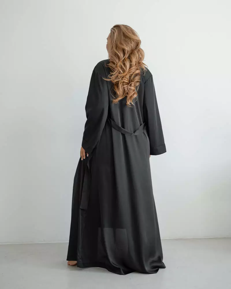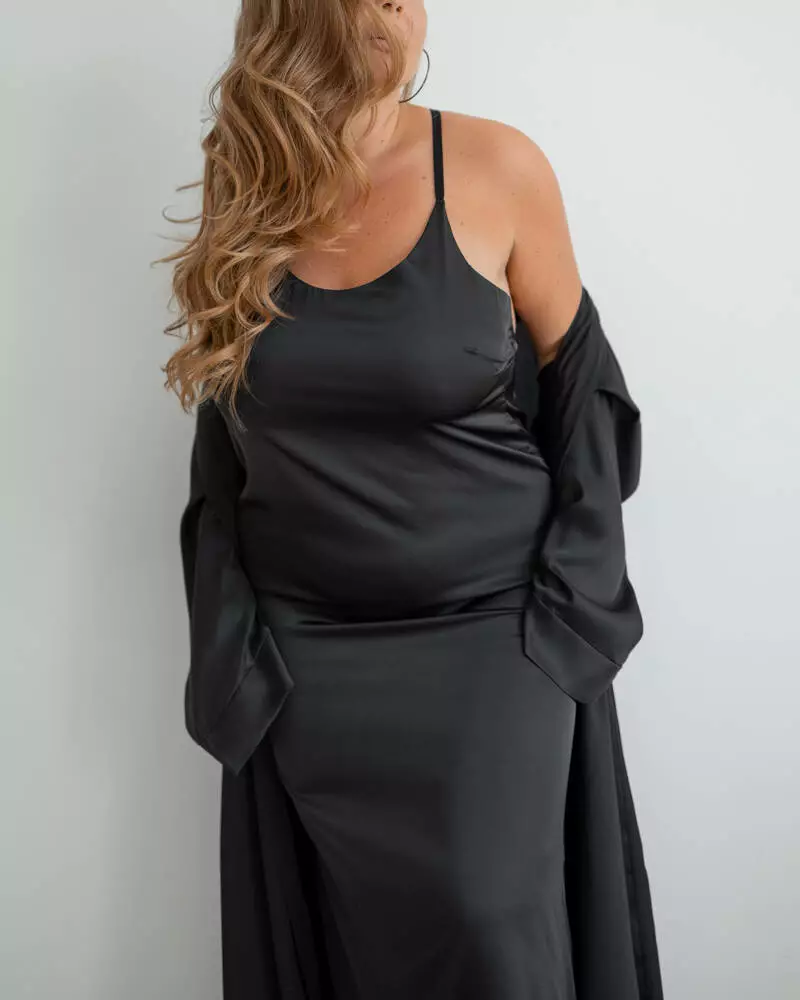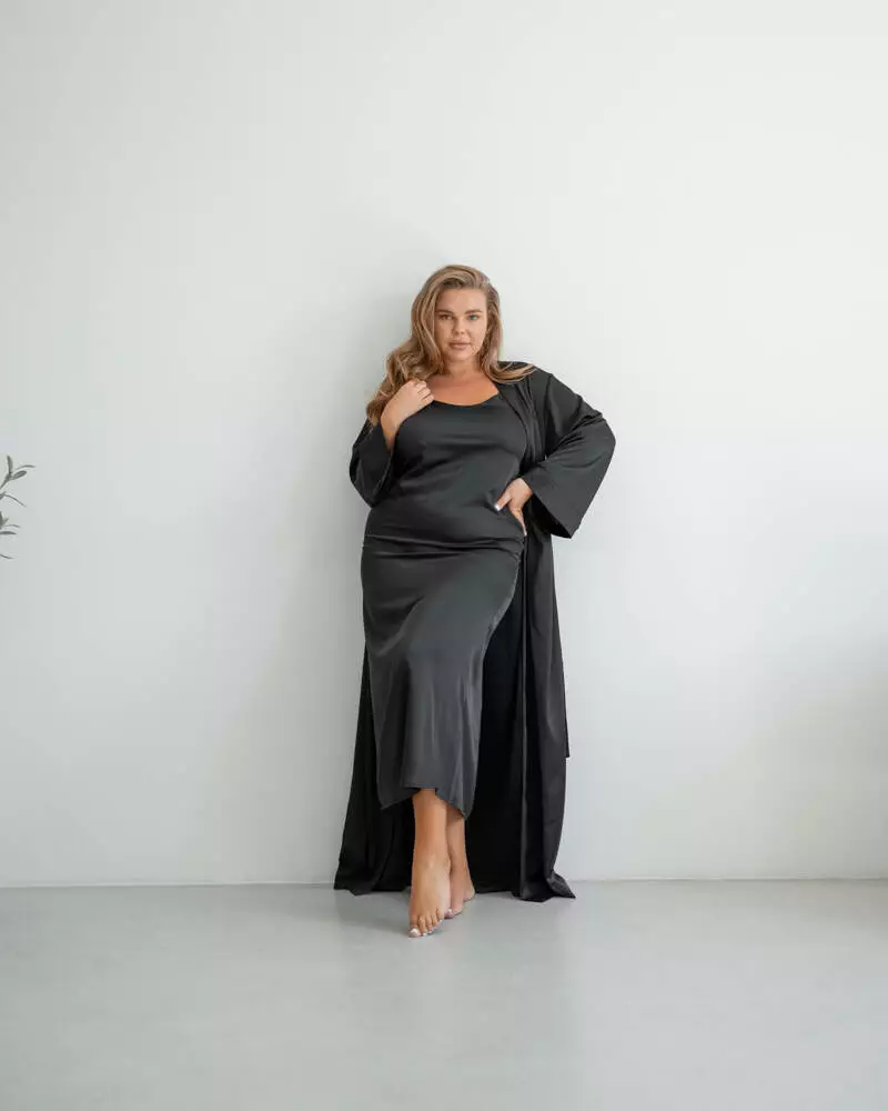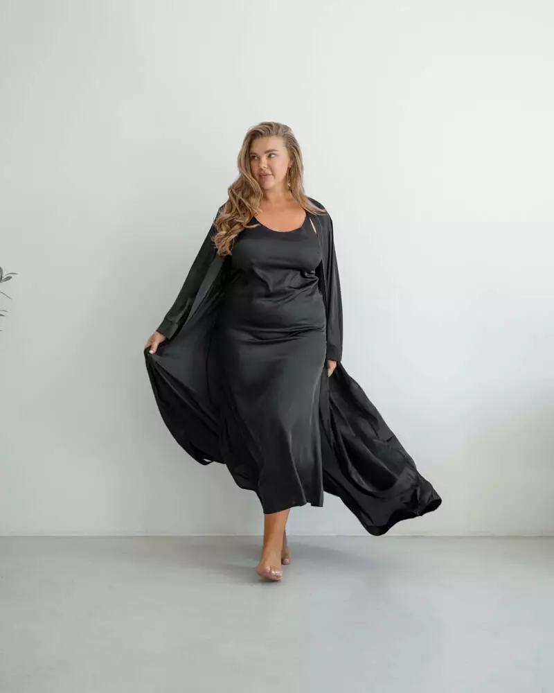 Нічна сорочка виконана з шовкової тканини Armani. Модель представлена в довжині міді з відкритою спиною, бретелі регулюються. Нічна сорочка чудово підкреслює жіночу фігуру і може поєднуватися з халатом.