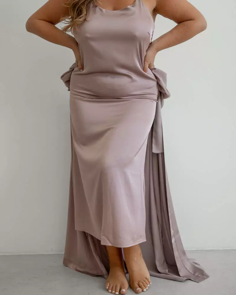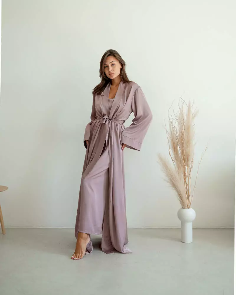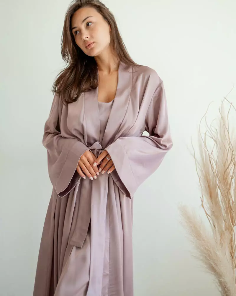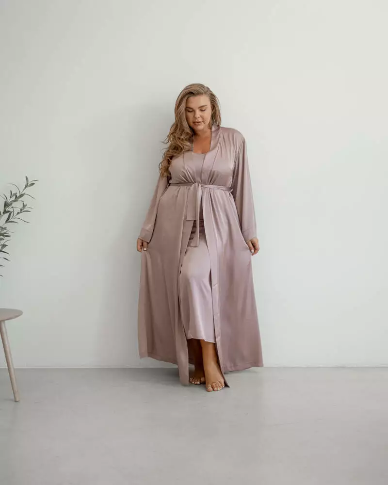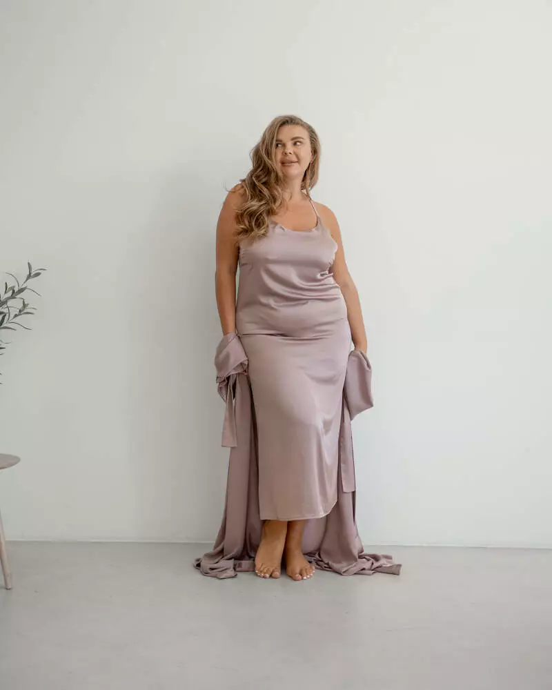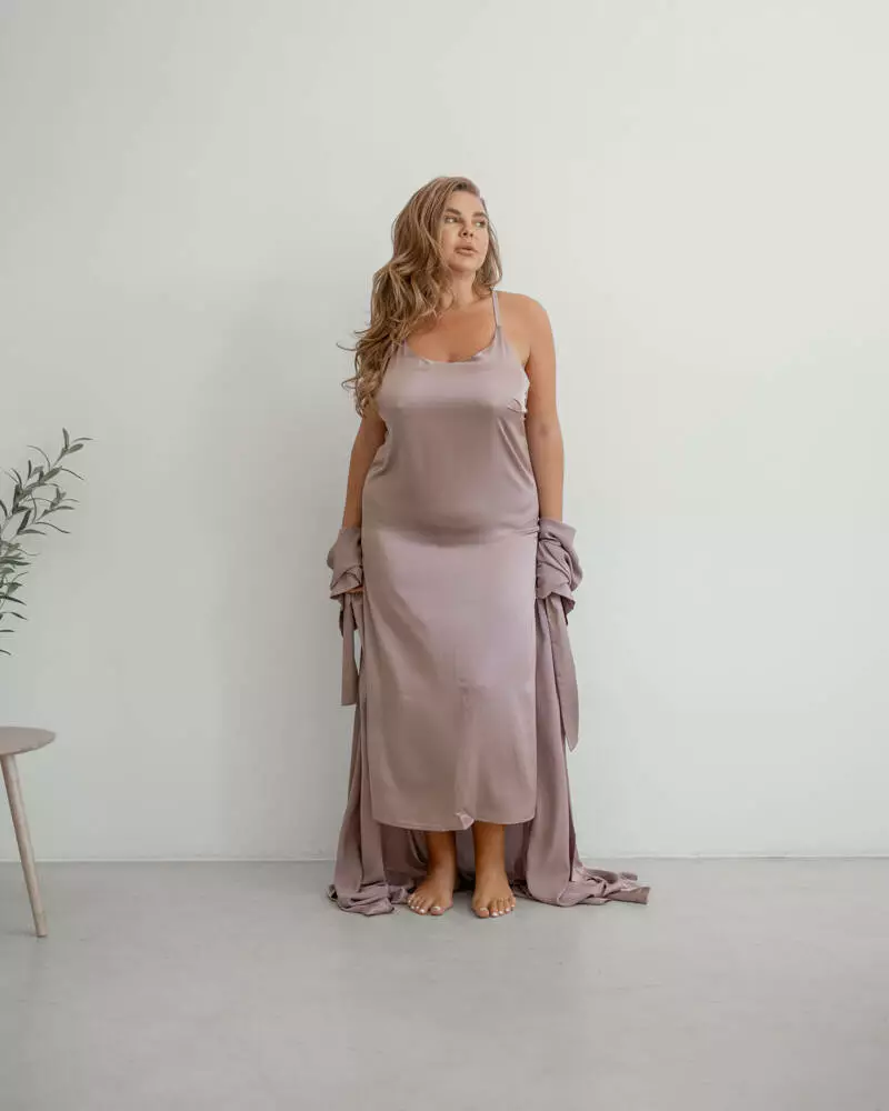 Нічна сорочка виконана з шовкової тканини Armani. Модель представлена в довжині міді з відкритою спиною, бретелі регулюються. Нічна сорочка чудово підкреслює жіночу фігуру і може поєднуватися з халатом.