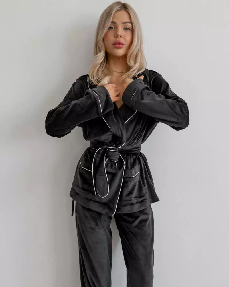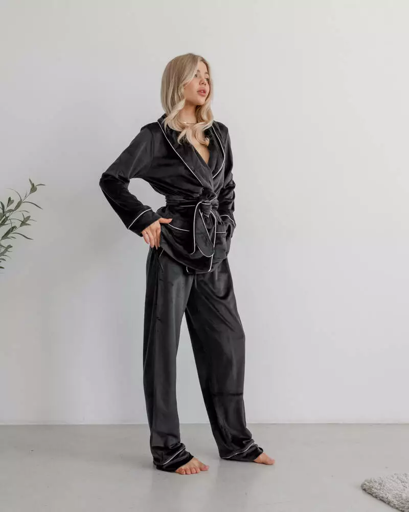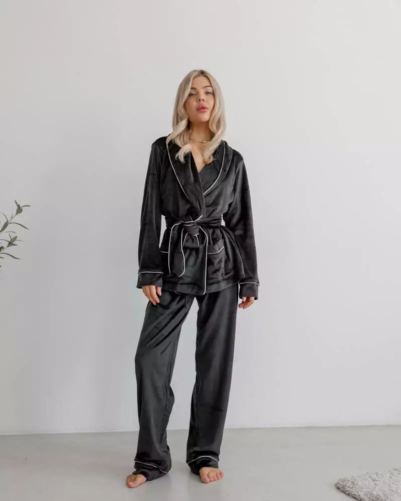 Жіноча піжама з велюрової тканини. Комплект складається з довгої сорочки з кишенею на грудях та штанів вільного крою на резинці. Жіночий костюм ідеально підходить для сну та домашніх справ. Тканина майже не мнеться, добре пропускає повітря і не втрачає колір при пранні. Увага, піжама розміру XL на замовлення: пошиття такої краси займе 2-3 дні