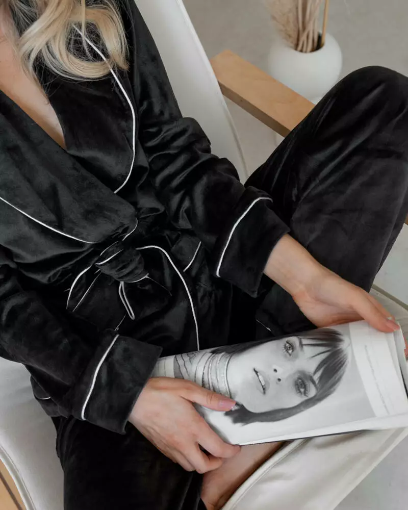 Комплект: Штани + Сорочка. Класичні штани вільного крою з резинкою на талії та кишенями. Сорочка з поясом на запах, всередині на зав'язках. Тканина: королівський плюш Туреччина на бавовняній основі Костюм оздоблений білим кантом, що додає піжамці вишуканості та виразності.