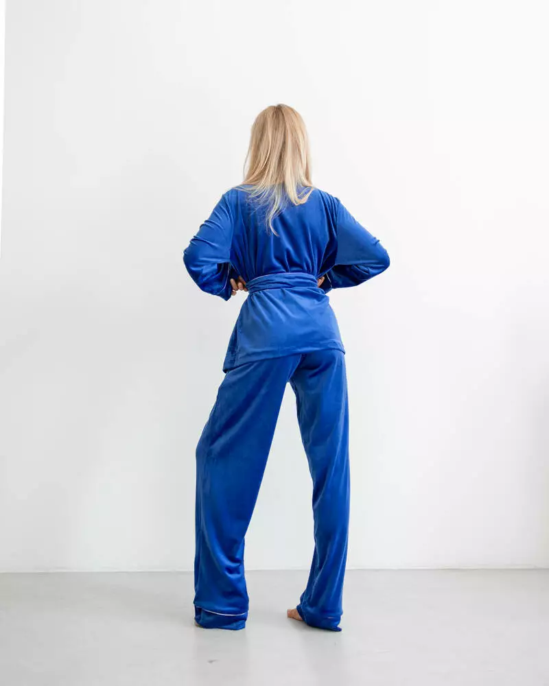 Комплект: Штани + Сорочка. Класичні штани вільного крою з резинкою на талії та кишенями. Сорочка з поясом на запах, всередині на зав'язках. Тканина: королівський плюш Туреччина на бавовняній основі Костюм оздоблений білим кантом, що додає піжамці вишуканості та виразності.