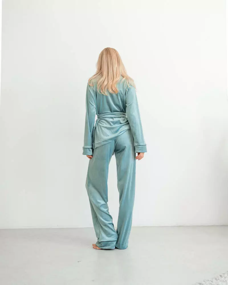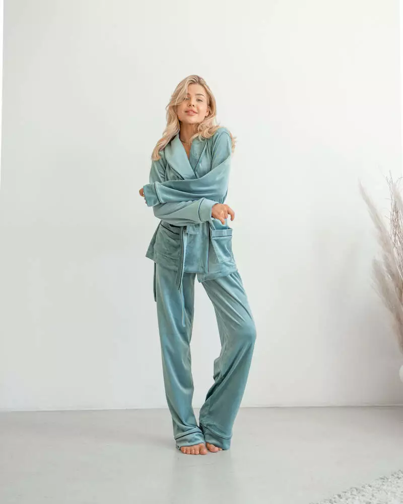 Жіноча піжама з велюрової тканини. Комплект складається з довгої сорочки з кишенею на грудях та штанів вільного крою на резинці. Жіночий костюм ідеально підходить для сну та домашніх справ. Тканина майже не мнеться, добре пропускає повітря і не втрачає колір при пранні. Увага, піжама розміру XL на замовлення: пошиття такої краси займе 2-3 дні