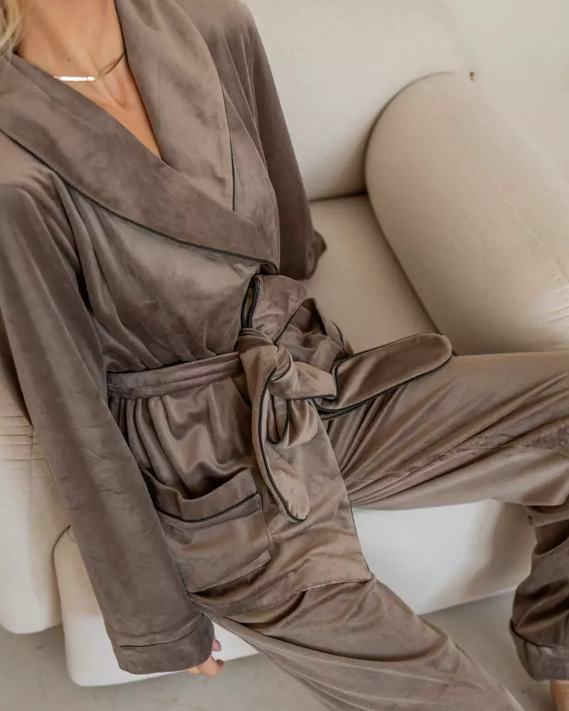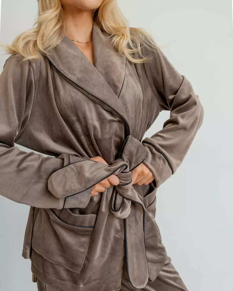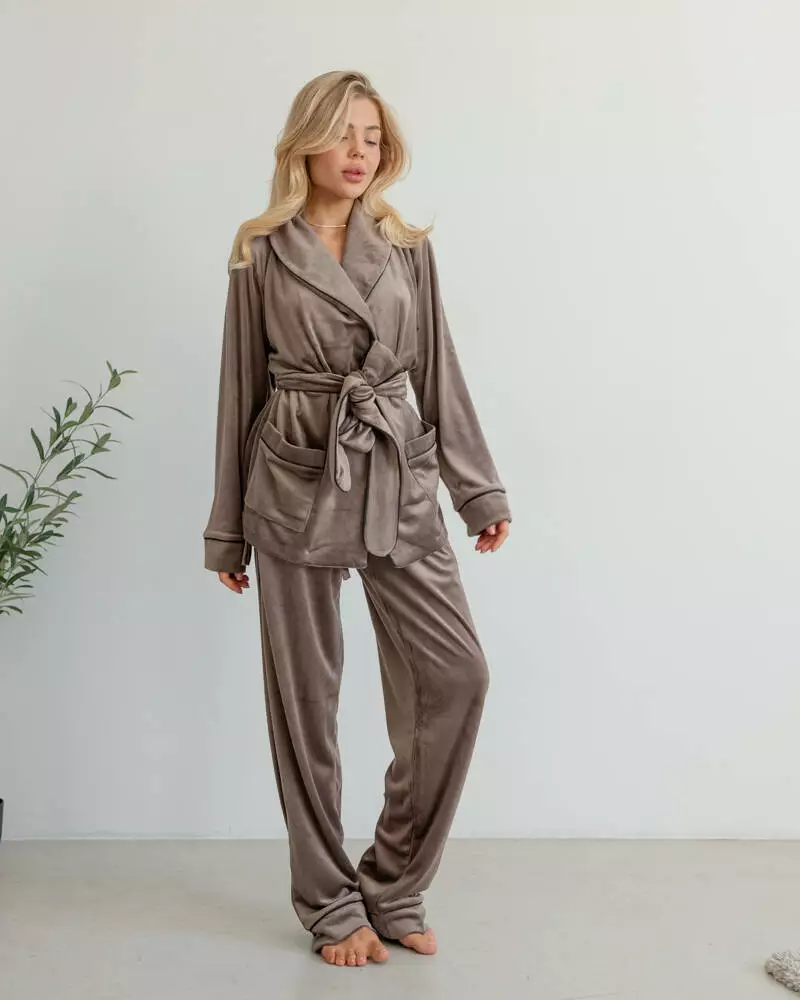 Комплект: Штани + Сорочка. Класичні штани вільного крою з резинкою на талії та кишенями. Сорочка з поясом на запах, всередині на зав'язках. Тканина: королівський плюш Туреччина на бавовняній основі Костюм оздоблений білим кантом, що додає піжамці вишуканості та виразності.