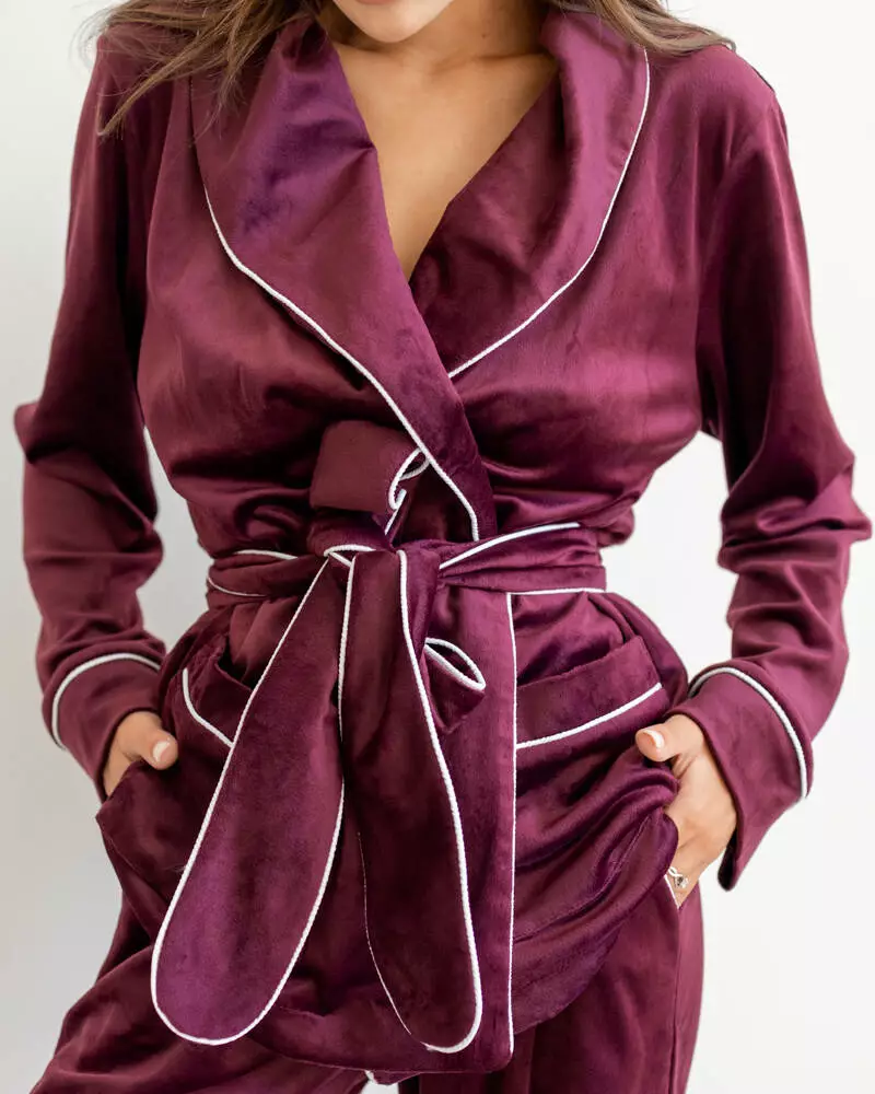Комплект: Штани + Сорочка. Класичні штани вільного крою з резинкою на талії та кишенями. Сорочка з поясом на запах, всередині на зав'язках. Тканина: королівський плюш Туреччина на бавовняній основі Костюм оздоблений білим кантом, що додає піжамці вишуканості та виразності.