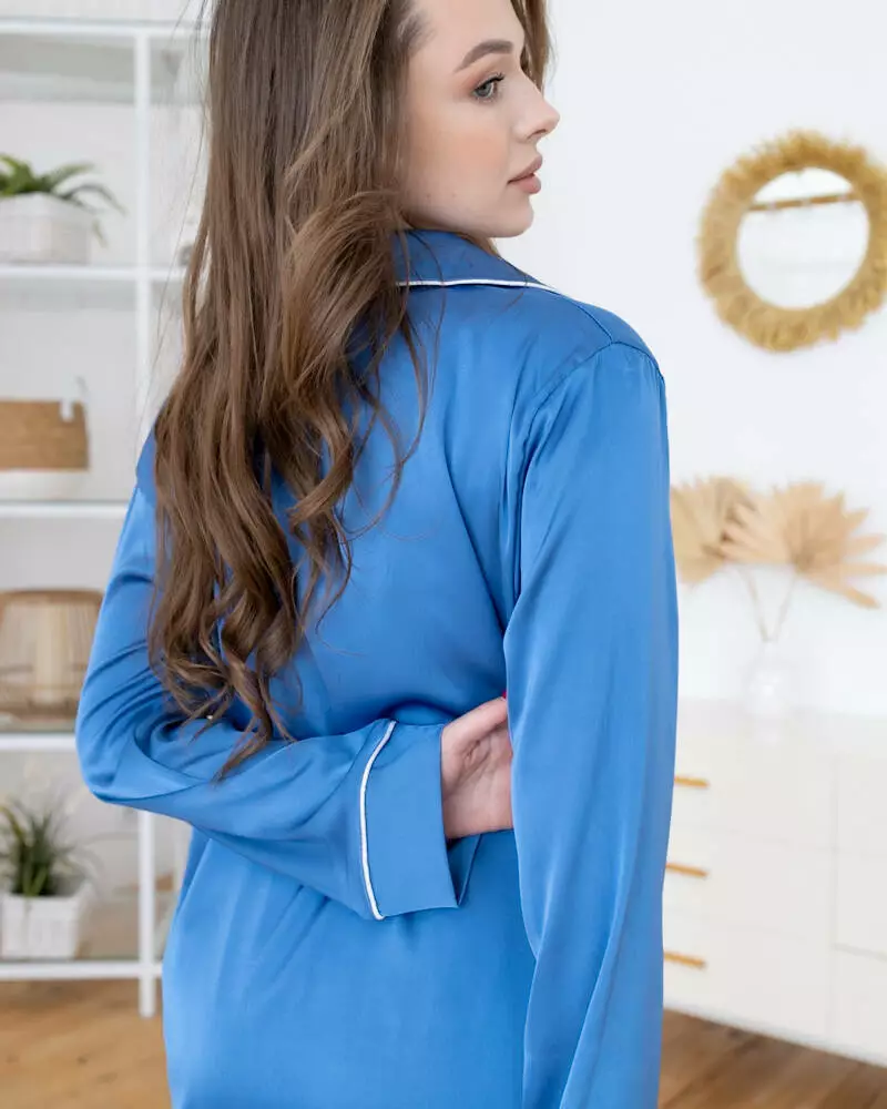 Жіноча піжама з шовкової тканини Armani. Комплект складається з довгої сорочки з кишенею на грудях та штанів вільного крою на резинці. Жіночий костюм ідеально підходить для сну та домашніх справ. Тканина майже не мнеться, добре пропускає повітря і не втрачає колір при пранні. Увага, піжама розміру XL на замовлення: пошиття такої краси займе 2-3 дні