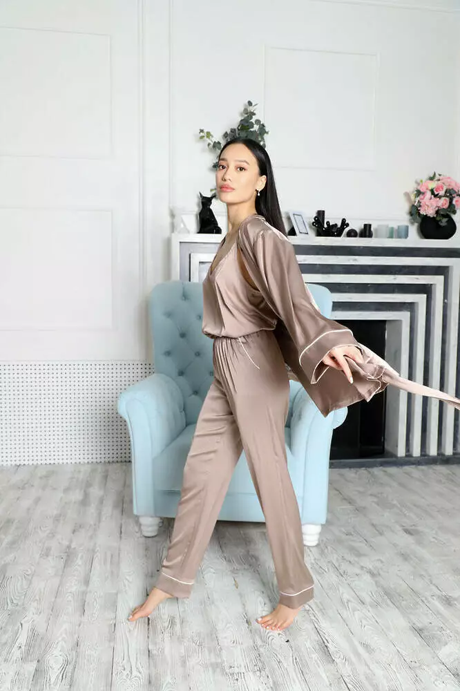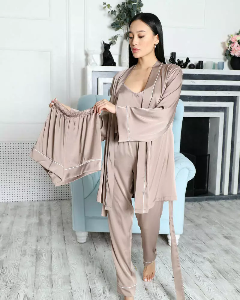 Піжамний костюм виконаний із якісного шовку Армані. Комплект: майка на лямках, зручний халат з поясом, штани вільного крою з кишенями та шорти. Піжама дуже зручна та універсальна. Можна носити в літню пору із шортами та під час холодів зі штанами, окремо добре виглядає халат з широкими рукавами.