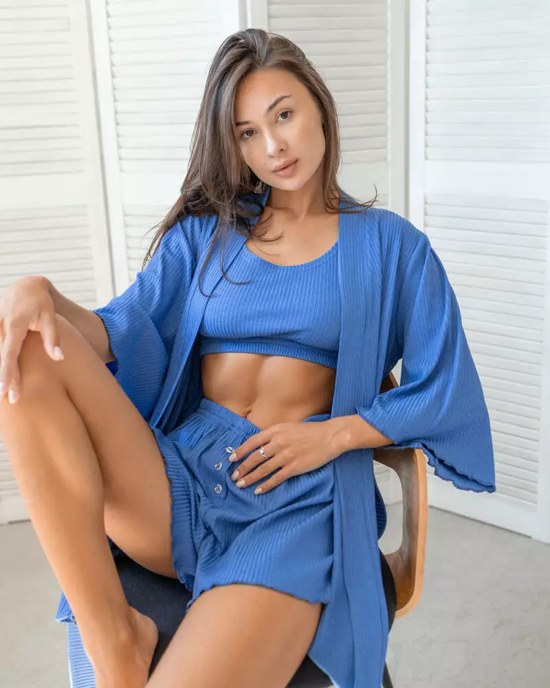 М'яка та затишна піжама із приємної до тіла тканини. Костюм, що складається із шортів на резинці, вільного крою халатика та топа, який добре сідає по фігурі, підкреслюючи жіночний силует. Тканина: трикотаж рубчик.
