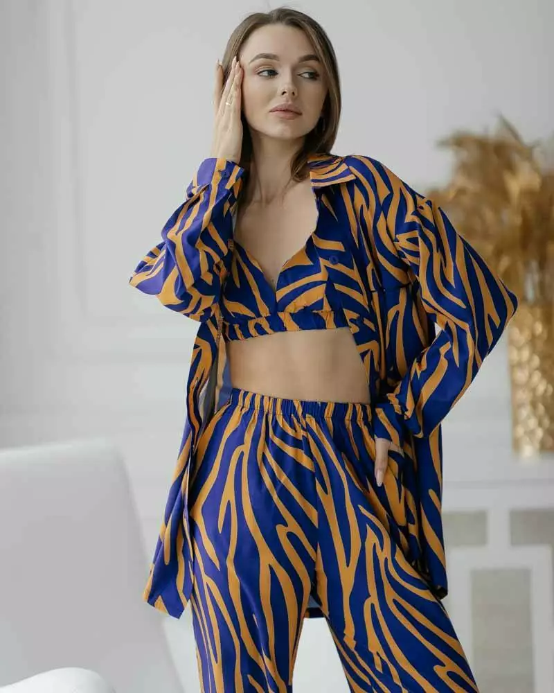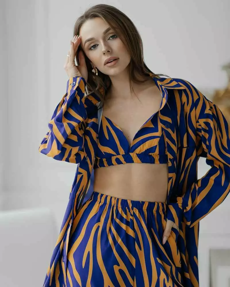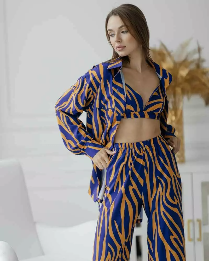 Сорочка прямого крою із застібкою на ґудзиках та відкладним коміром. Штани з еластичною резинкою на талії не обмежують руху завдяки вільному крою. Комплект домашнього одягу з топу, штанів та сорочки вільного крою підкорить вас своєю витонченістю. Комплект із 3-х речей відмінно підійде як для вагітних, так і як одяг для дому. Сорочка чудово поєднується з купальником і сміливо можна брати на пляж. Костюм йде з якісної тканини софт. Дуже приємна до тіла.