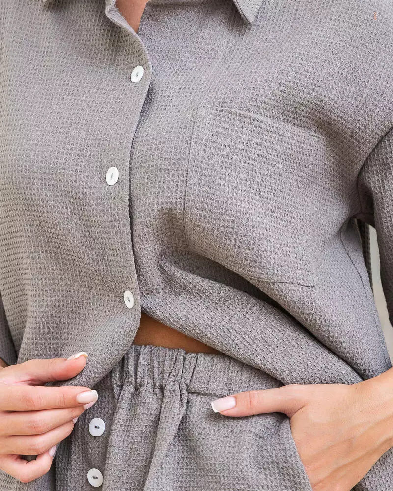 Комплект складається з вільної сорочки на ґудзиках та укорочених шортиків на резинці з кишенями. Виконаний із якісної тканини "вафля". Чудово підійде для літніх прогулянок та для домашнього дозвілля.