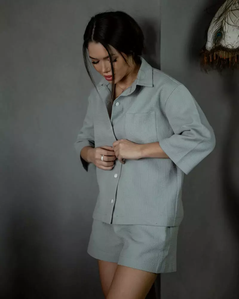 Комплект складається з вільної сорочки на ґудзиках та укорочених шортиків на резинці з кишенями. Виконаний із якісної тканини "вафля". Чудово підійде для літніх прогулянок та для домашнього дозвілля.