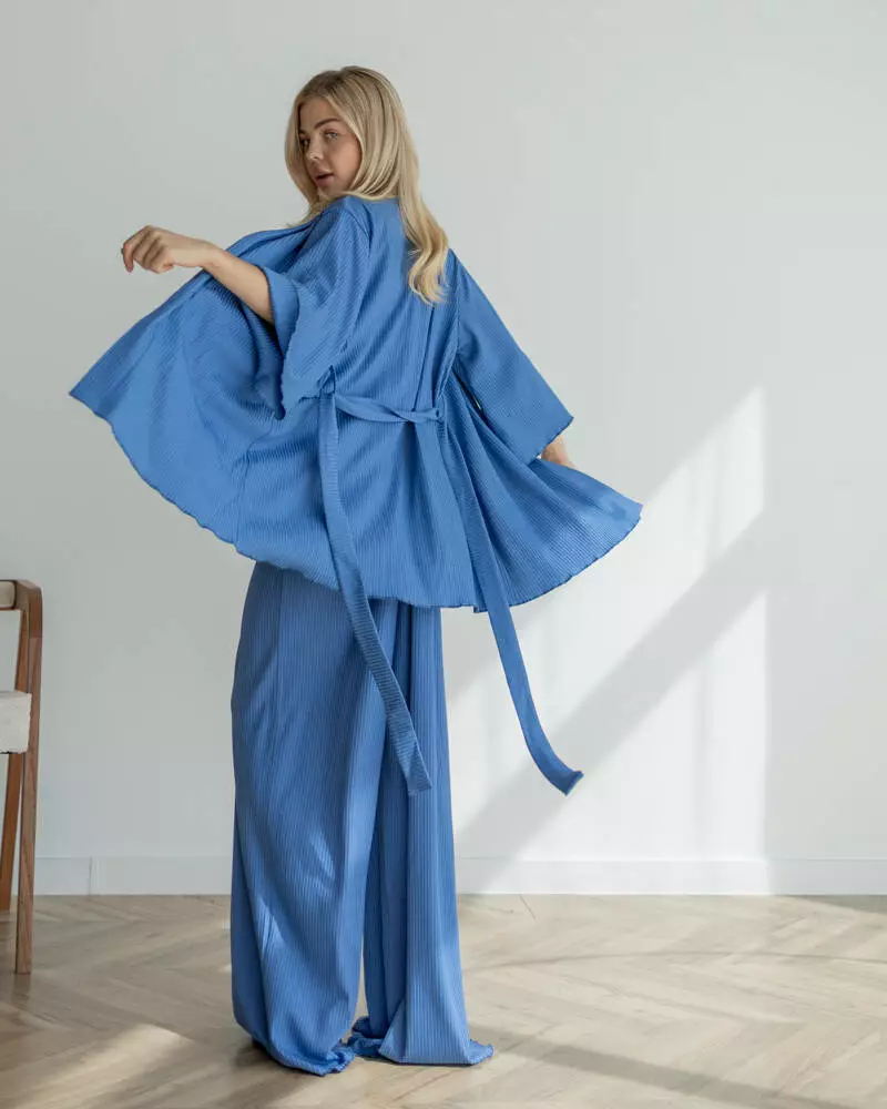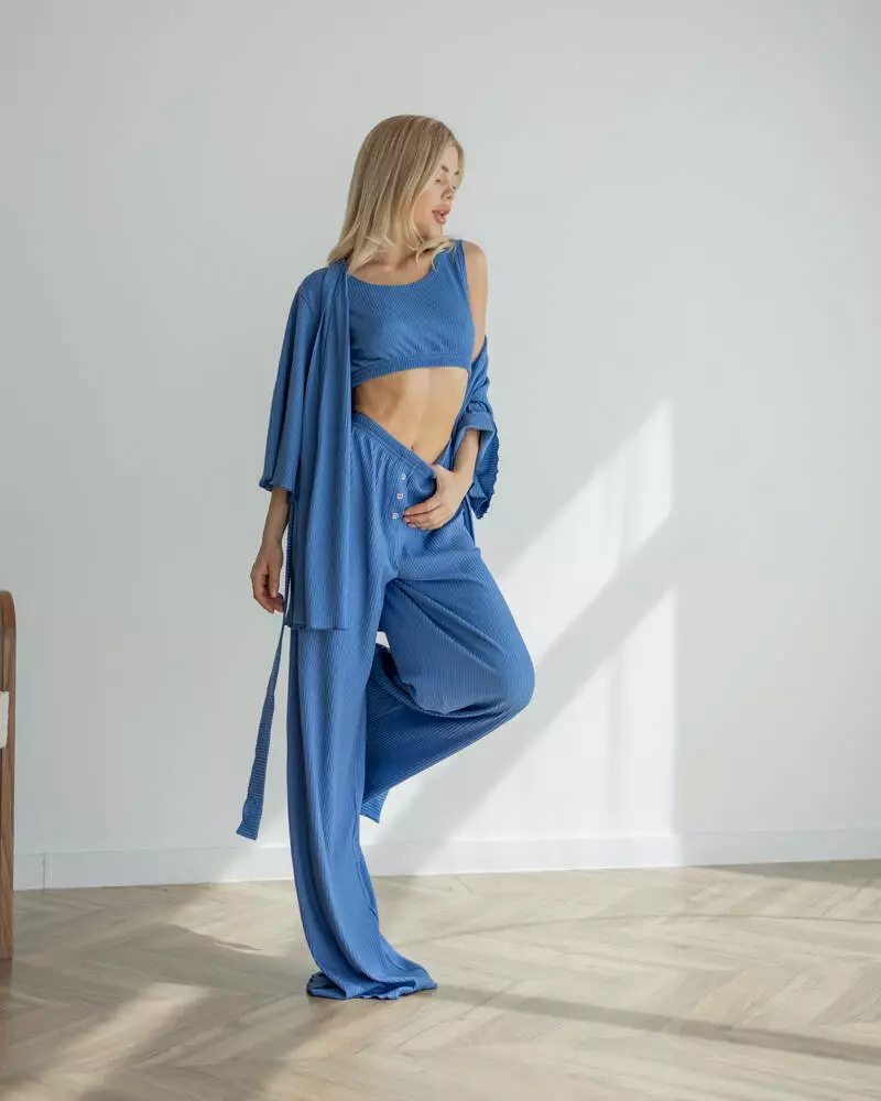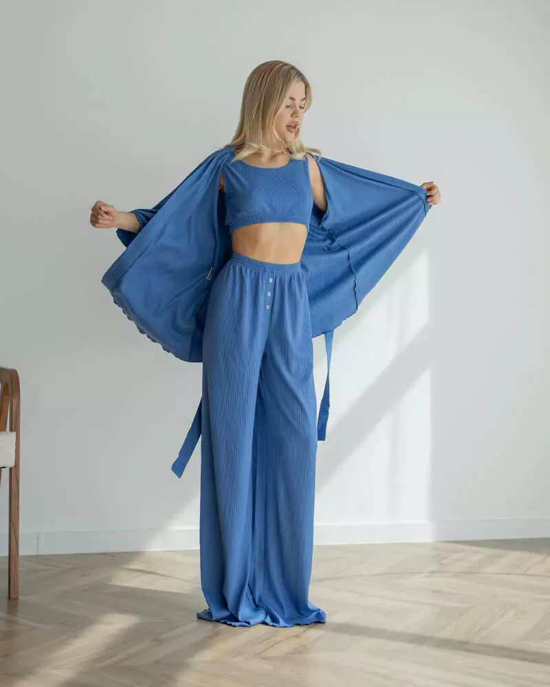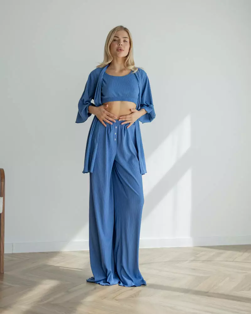 Довгі вільні штани на мякій резинці із приємного матеріалу трикотаж рубчик. Модель дуже зручна, завдяки фасону не сковує рухів та зберігає Ваш комфорт. Штани чудово поєднуються із піжамним комплектом-трійкою "Dana".