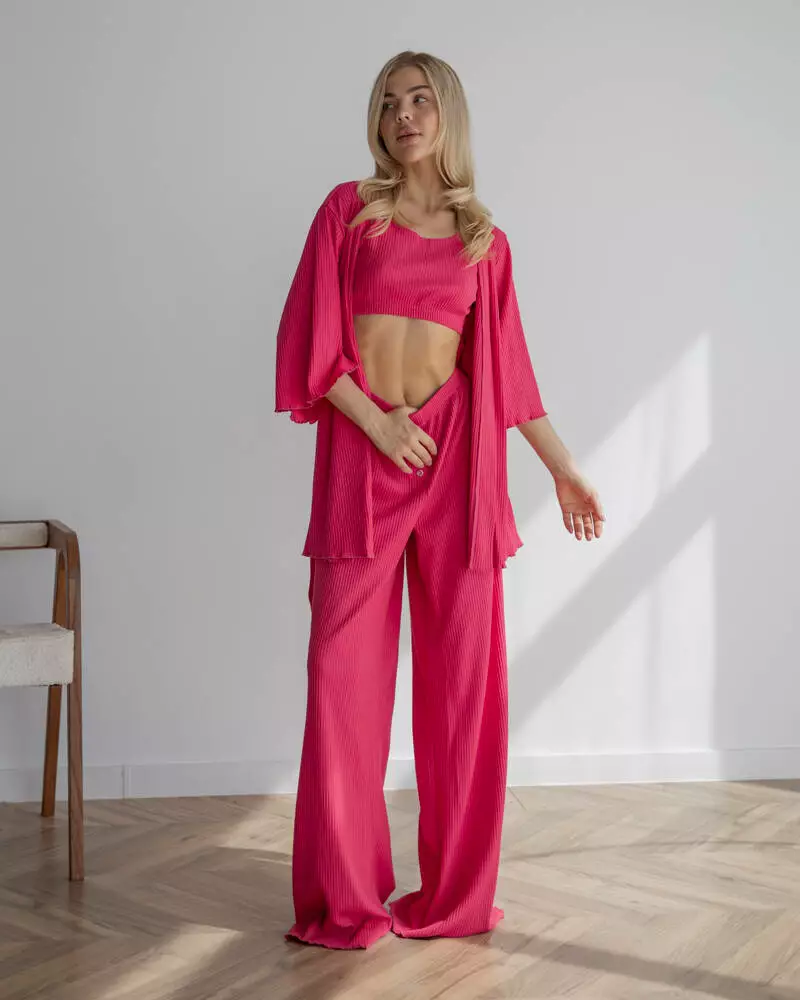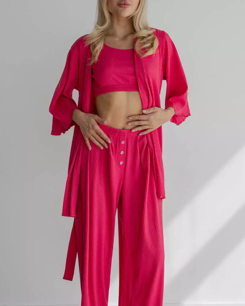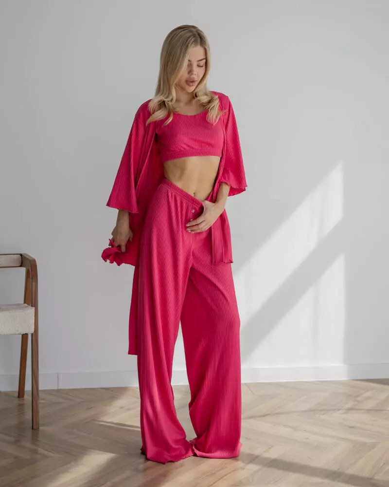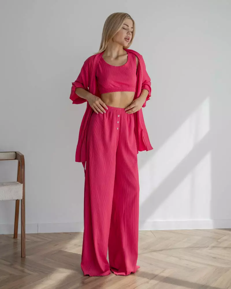 Довгі вільні штани на мякій резинці із приємного матеріалу трикотаж рубчик. Модель дуже зручна, завдяки фасону не сковує рухів та зберігає Ваш комфорт. Штани чудово поєднуються із піжамним комплектом-трійкою "Dana".